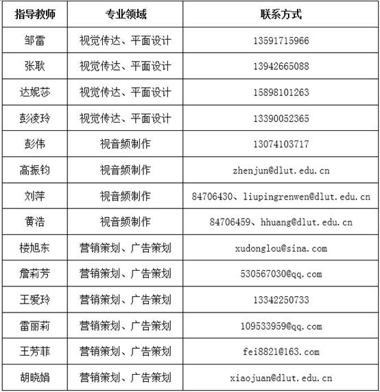 第十一届大学生广告艺术大赛大连理工大学选拔赛组委会提供有关指导老师的名单及联系方式,参赛同学可根据作品种类自行联系指导老师。注:请发短信