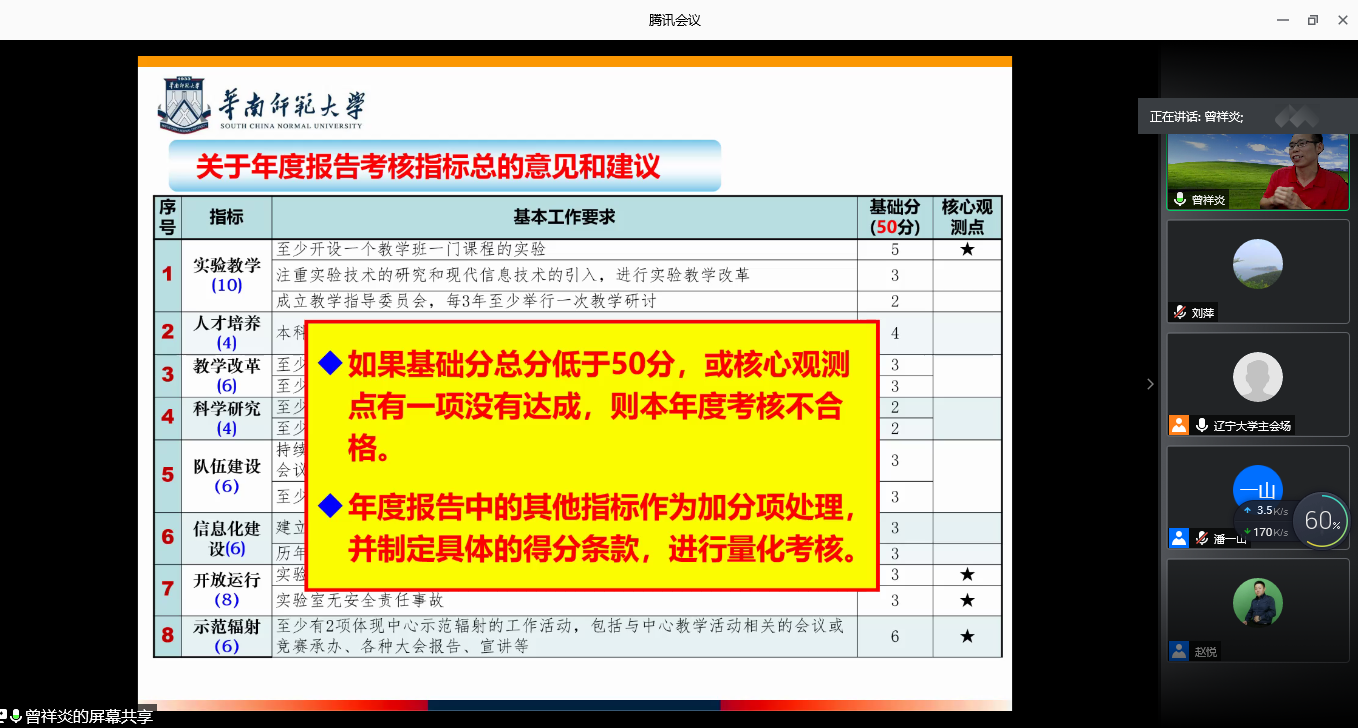 “国家级文科综合实验教学示范中心评估考核指标研讨会”召开的目的是根据《教育部高等教育司2020年工作要点的通知》(教高司函[2020]1号)精神,为做好示范中心迎评准备工作,深入理解评估考核指标的具体要求,并以评估考核指标为引领,在未来的实验、实训、实践教学中更好地发挥国家级文科综合实验教学示范中心的示范作用,聚焦文综学科组基于年度报告考评指标体系存在的共性问题,研讨示范中心今后的发展建设方向。