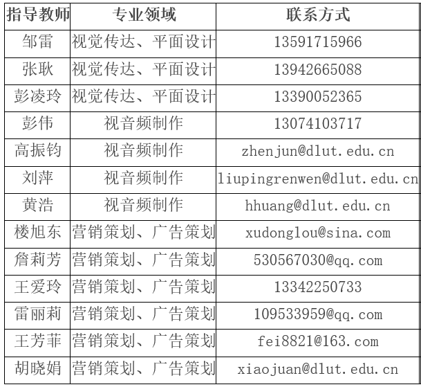 第十三届大学生广告艺术大赛大连理工大学选拔赛组委会提供有关指导老师的名单及联系方式,参赛同学可根据作品种类自行联系指导老师。注:请发短信
