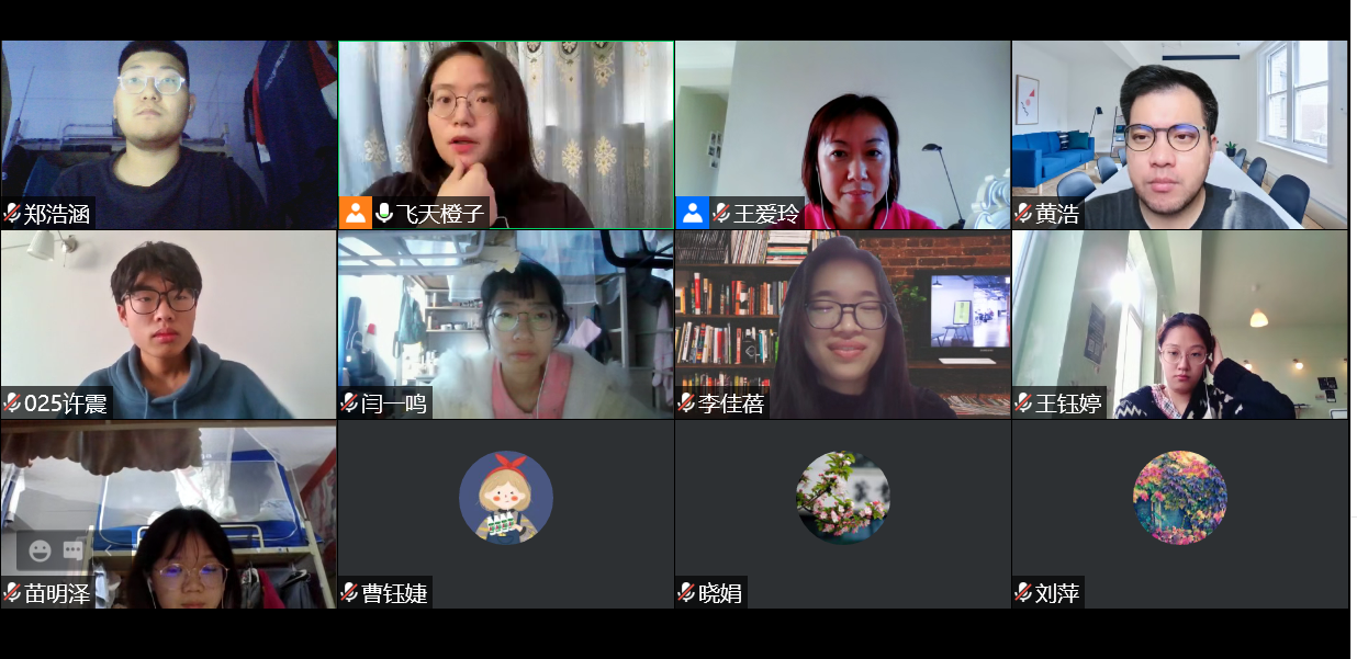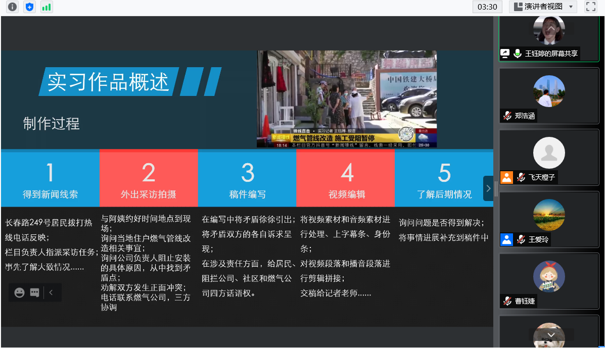 评比采用学生汇报、评委老师点评打分的形式,通过腾讯会议线上进行。活动在新闻传播系党支部书记王芳菲老师的主持下有序进行,到场的评委老师包括新闻传播系主任王爱玲老师、系副主任胡晓娟老师、文科综合实验教学中心的刘萍和黄浩老师。