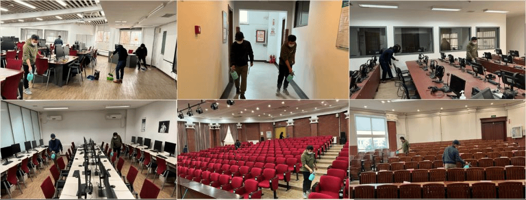 12月6日清晨,伴随学校恢复教育教学秩序,文科中心全体人员在全中心范围开展了彻底的通风、保洁及消毒工作。