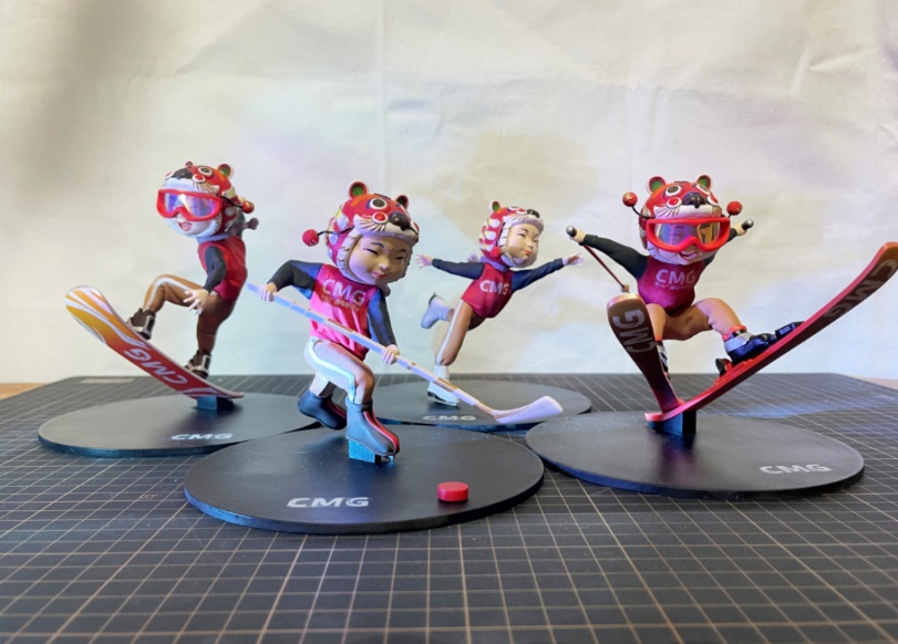“2022年是虎年,我们选择了十二生肖中的虎娃为主要人物模型,将原设定的人物外貌加以修改,并把祥云和丝绸的元素融于服装之中;选取了冬奥会中比较具有代表性的四类比赛,分别为越野滑雪、滑板滑雪、花样滑冰和冰球;滑雪运动上选取的动作需要具有活力,滑冰以及冰球的动作要表现得更加委婉。”时间紧任务重,手办制作小组快速敲定方案,明确分工。