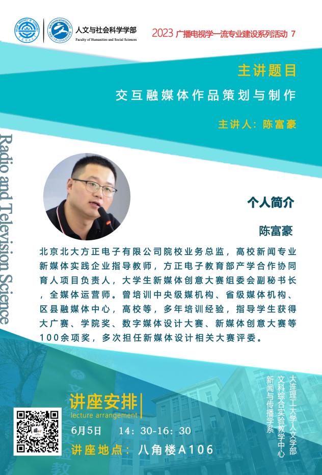 2023年6月5日下午14:30在八角楼A106,大连理工大学新闻传播学系与文科综合实验教学中心联合邀请北京北大方正电子有限公司院校业务总监陈富豪,来校分享了题为《交互融媒体作品策划与制作》的主题讲座,主要介绍了交互融媒体作品的定义特点,以及如何制作出一部完整吸睛的交互作品。