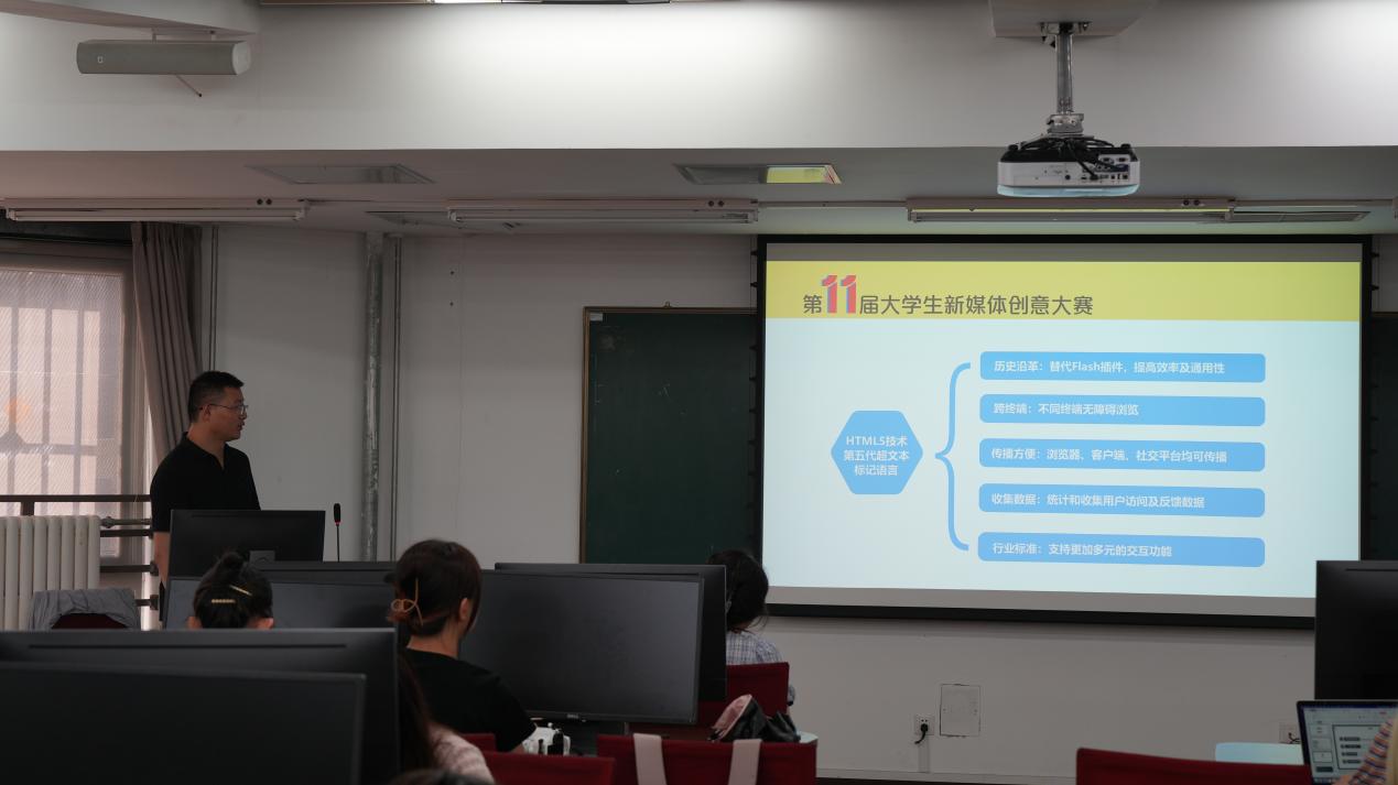 首先,陈富豪老师通过作品体验的方式引入,带领同学们认识H5,详细介绍了H5在用户体验、内容呈现、交互设计等方面的优势。他提到H5的多设备适配性,强调了其在移动端渠道传播中的实用性和重要性,引起了在场师生们对这一类新闻作品的好奇与探究。