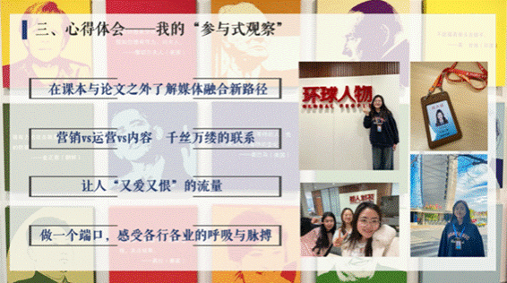 带着三年来在广电专业收获的专业沉淀和实务技能,同学们走进媒体行业,体验从新传学子到媒体人的身份转变。张韶瑾在谈到她在人民日报《环球人物》杂志实习的三个月经历时感慨道:“在媒体实习有点像《做新闻——现实的社会建构》这本书中说的‘参与式观察’,身处其中,了解到的可能才是更具象的”。三个月的实习中,她实地体验了“人民日报中央厨房”的媒体融合内容运作模式,也在多元的采访实践中“感受各行各业的呼吸与脉搏”。“我们原来使用的剪辑软件是PR和剪映,但是传统媒体有联网系统的要求,必须使用索贝软件进行剪辑,在操作过程中我增强了实务技能”,在东方卫视实习的俞凯薇同学向同学们分享她在实习中增长的传媒认知。
