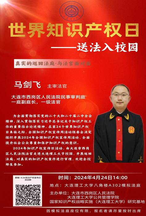 2024年知识产权宣传日活动,由大连市西岗区人民法院法官走进大连理工大学校园,开展巡回法庭,对真实的知识产权案件进行审理,欢迎全校师生参加。