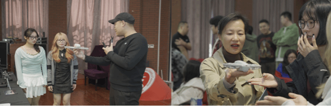 活动特别设置“真机操控体验区”和“AI+XR虚拟制片体验区”,活动尾声设置学生分组体验环节,师生通过无人机试飞模拟系统与XR场景交互装置,沉浸式感受“低空视角探索校园”与“虚拟场景实时创作”的双重乐趣,现场气氛热烈。