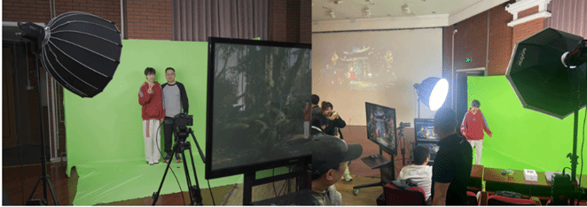 上海随幻智能技术团队通过实时渲染演示,详解XR虚拟制片的核心技术逻辑——从绿幕抠像技术迭代到实时合成引擎的场景交互逻辑,层层递进揭示“虚拟场景-真实拍摄-实时合成”的全流程技术链路。现场展示的随幻XR虚拟制片设备矩阵(包括高精度动捕套装、虚拟摄像机、LED背景墙控制系统)引发师生浓厚兴趣,技术人员现场演示如何通过传感器阵列实现虚拟场景与真实人物的光影同步。