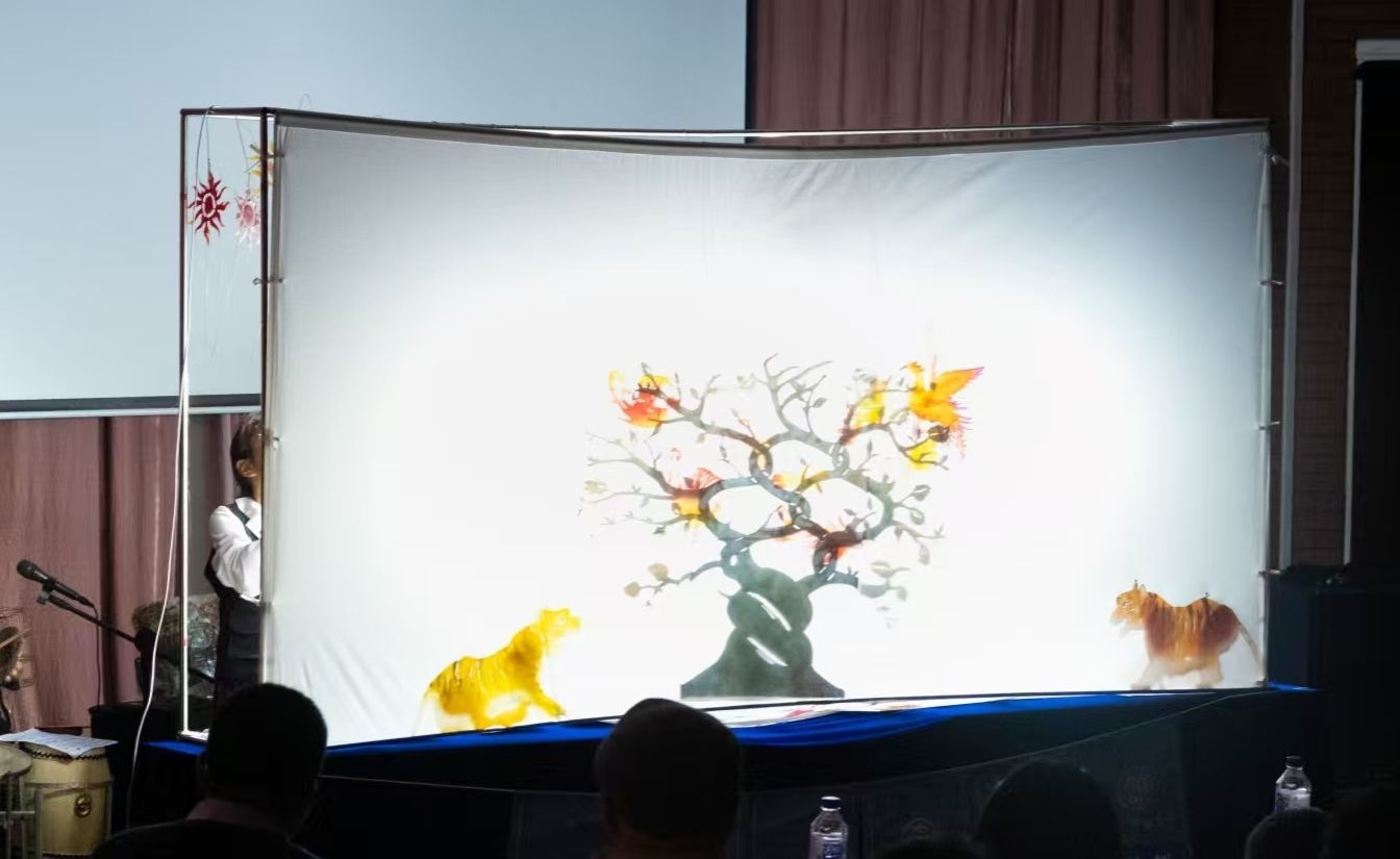 展演阶段,刚刚受邀参加乌镇戏剧节嘉年华的大工皮影戏剧团与鄂文武携原创作品《脊梁虎》再次登台,讲述后羿在脊梁虎感召下重振雄风、射落九日的神话故事。“皮影系”社团以精湛的操纵技艺搭配悠扬的辽南唱腔,带领全场师生沉浸在这段关乎勇气、觉醒与精神脊梁的光影叙事中。