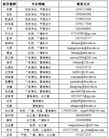 第18届大学生广告艺术大赛大连理工大学选拔赛组委会提供有关指导老师的名单及联系方式,参赛同学可根据作品种类自行联系指导老师(请短信或邮件形式联系指导教师)。